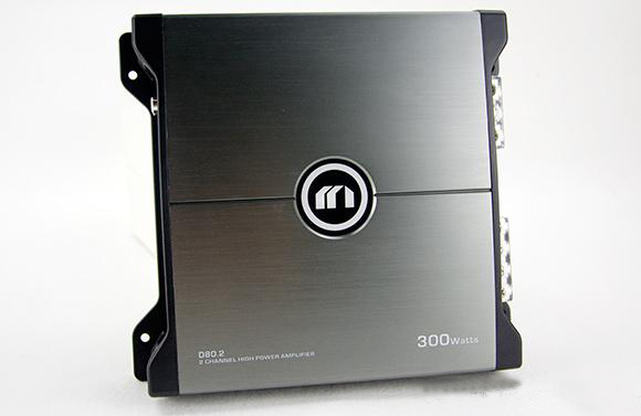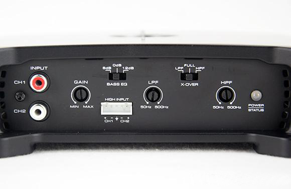 D80.2面板相对设计简单,输入信号提供高电平输入和两路RCA输入,高低通50Hz-500Hz可调,上侧的调节按钮可以进行低音的Bass EQ处理,可调值为0-12dB,另外一侧按钮则可进行高通、低通、全通设置。两声道输出时可以每声道80W输出功率,2Ω状态下功率更可达120W×2,最大峰值输出可达到300W。.