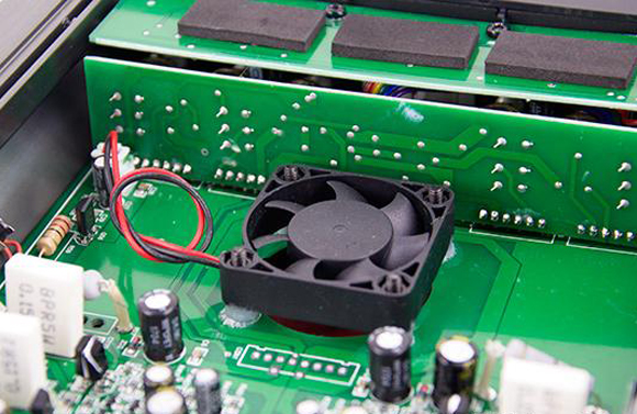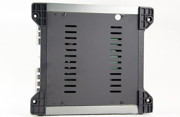 D80.4其1/2声道、3/4声道独立进行桥接输出处理,两侧布满了进行相应调节的按钮,也可以独自设置高、低、全通,以及独立的Bass EQ等设定。内部电路可以看到拥有大型环形线圈提供强大电源管理能力, 因为最大输出功率达到600W,所以D80.4内部增加了散热冷却风扇以及在风扇周边范围留空,保证散热有效对流。