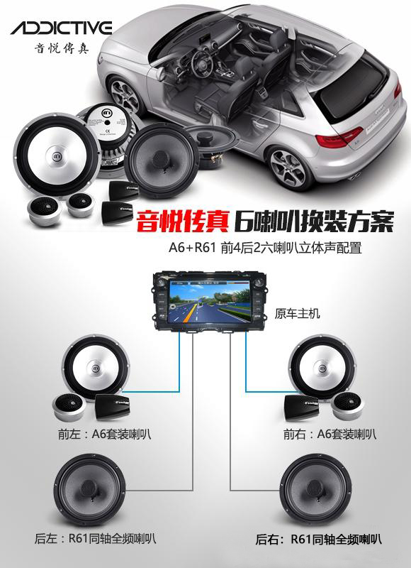 在一般的车型配置上,除了前声场喇叭,后声场喇叭应该是第二重要的配置升级,因为绝大部分小车的后声场,通常都只是一个6寸中音,它无法满足整个车内音响系统的真实还原,特别是中高频和高频的缺失,包围感和丰满度效果不理想。因此建议在原车位无损升级则用高品质的同轴喇叭,如音悦传真旗下的R61喇叭。如要更好品质,可以选择如A6或D6这样的套装喇叭。
