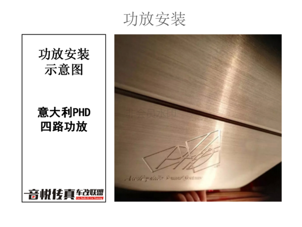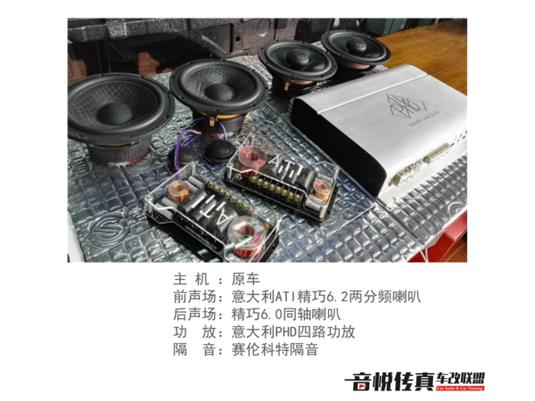 虽说这套喇叭易推动但是它原车的主机并不能够使喇叭的音效彻底的呈现出来 所以需要一台意大利PHD四路功放来推动这套喇叭使得音响的音效更完美。