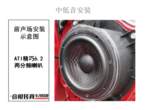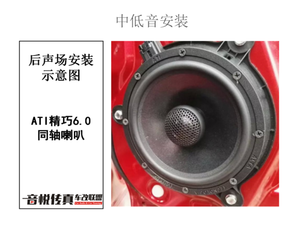 后声场是一套ATI6.0同轴喇叭 主要是辅助前声场 同品牌的搭配音色鲜明 前后搭配起来使得整个车内呈现出立体感 层次感使得高低音乐分明。