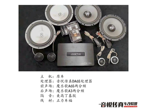点评:整套系统并没有采用倒模工艺,都是在原车位无损进行加装升级,利用音悦传真DA6S处理器直推前后声场,4x64w专用DSP功放,很好的完成了带动整体声场均衡的任务。