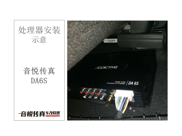 处理器安装在副驾驶座椅下方,不占用空间,音悦传真DA6S是根据车型和喇叭配置主动式电子分频 .根据喇叭安装位置而精准时间校准. 根据车主听音风格EQ均衡而音色修饰。集数字电声科技与发烧音响文化,可以接入原车音响系统、发烧音响主机、为音响爱好者量身定制精准的发烧级音响效果。