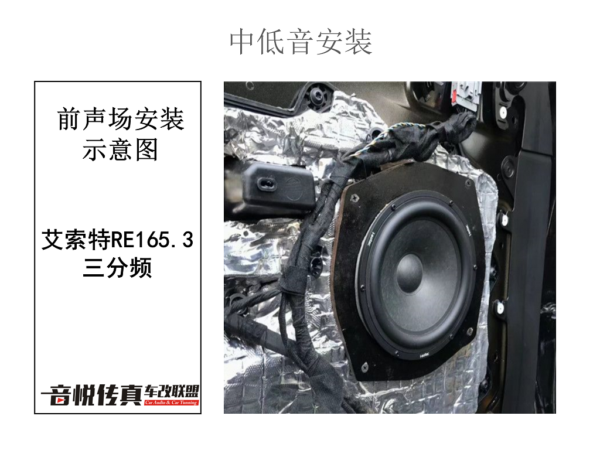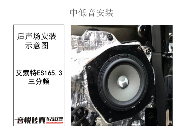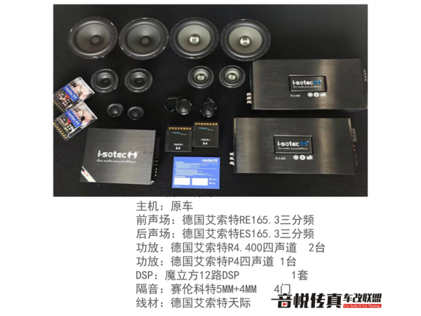 后声场采用德国艾索特ES165.3三分频,前后同型号音响相互辅助 互补前后喇叭的不足 这样可以使喇叭的音效效果更好
