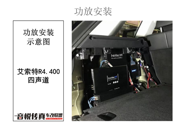 虽然前后声场搭配起来是很好但是原车的主机并不足以推动它 不能让喇叭应有的效果发挥出来 所以在这就要有功率足够的功放来推动喇叭 于是便选择了一台德国艾索特R4.400四声道和一台德国艾索特P4四声道 在两台功放的辅助整套系统可谓是如虎添翼