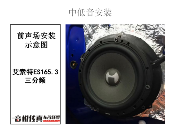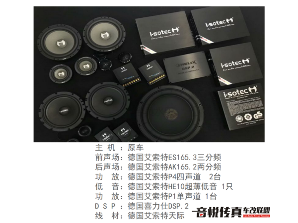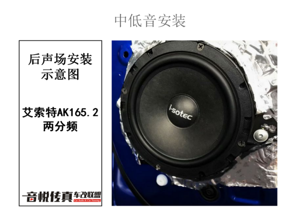 艾索特两分频,安装于后声场,AK165.2的高音清亮 中低音饱满有力前后声场搭配起来在车内形成了一种环绕的声场,可以说是同样的器材,不同的店家改装,也是会有不一样的效果。
