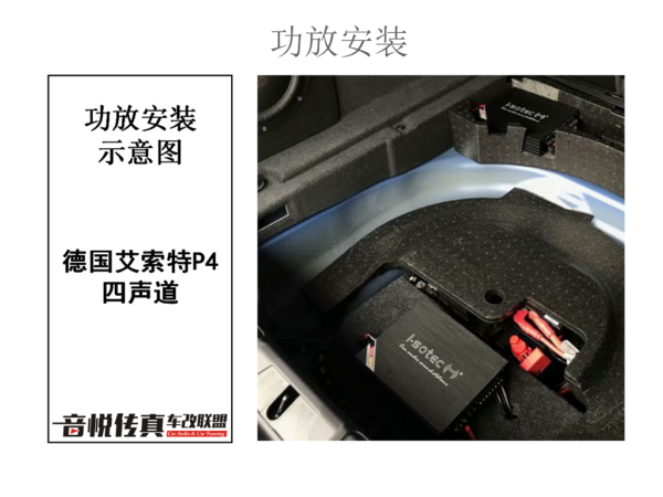 好的喇叭就要有台好的功放来辅助,艾索特喇叭虽说没有功放的助推也能听了,但是这位车主是个对音响要求比较高的人,所以光是喇叭并不能满足车主对音乐的追求,于是便安装了德国艾索特P4四声道功放。