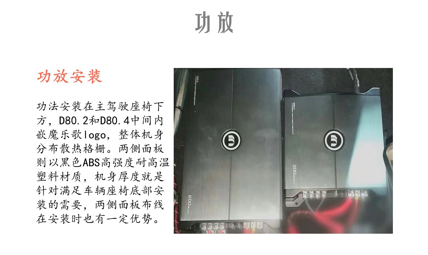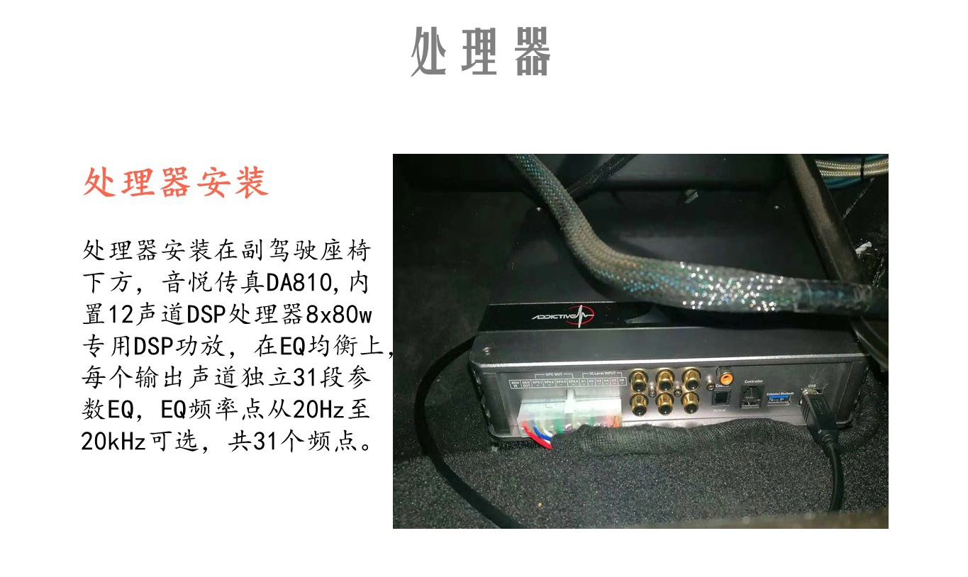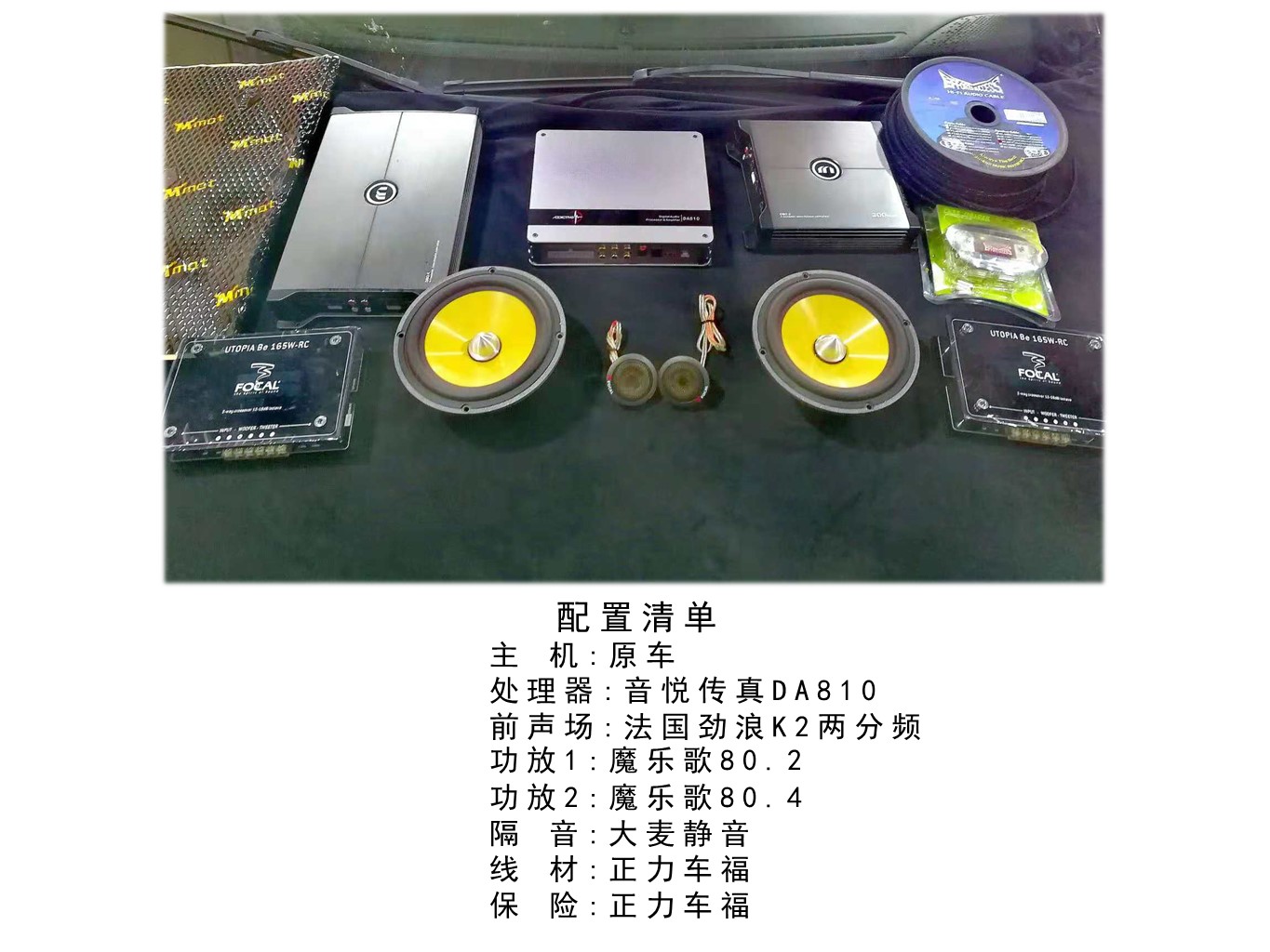 酷威是美国道奇旗下的一款大七座车型,以性能强悍著称,颇受欢迎。这位车主决定对爱车进行隔音专项处理和音响升级,降低车内噪音,提升汽车品质,改善车内驾驶环境。点评:整套系统安装上,在保证音质的情况下,原车主机作为音源,通过音悦传真DA810DSP给两台功放分配工作,魔乐歌80.4负责推动前后声场,魔乐歌80.2负责推动超低音。这样做的好处是音乐的每个细节都能运筹帷幄,制造出身临其境般的感觉。音响改装不分车型、品牌、价格、只要你喜欢音乐热爱音乐、同时你的爱车又不能满足你的需求,那么改装或许是个不错的选择。开自己的车,听自己喜欢听的音乐。