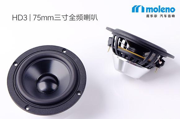 2017年音悦传真正式推出了一系列的魔乐歌新产品,如D63和HD63的三分频套装,应用的中音单元是75mm锥形音盆振膜HD3。从音悦传真车改联盟了解到,HD3其实应被称之为3寸全频喇叭,因为它的高频可以延伸到20kHz,这是普通高音才能到的极限;而中低频下限也可以到150Hz,这是男声较低音域的部分,HD3的确有着非常好的宽频响应。