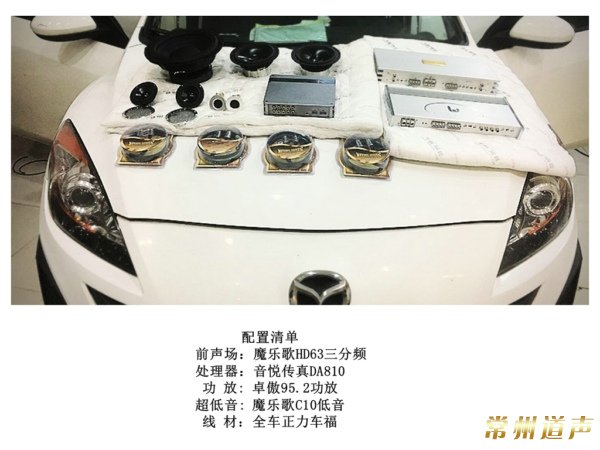 本期冠军案例赏析的马自达3,是此次音悦传真车改联盟车队出征MECA苏州站的功臣之一,也是本届赛事凭借魔乐歌HD63+音悦传真DA810DSP处理器的经典组合夺冠的战车之一。在各大赛事中,音悦传真DA810+魔乐歌HD63的组合夺冠已是屡见不鲜,原因为何,我们从这辆马自达车上来分析。这辆马自达的配置依旧不算是特别的复杂,除A柱和三角区进行了倒模释放了声场之外,并没有太多花里胡哨的操作。配置上,前声场与DSP是上文提过的魔乐歌HD63+音悦传真DA810DSP的组合,功放上选用了功放推动,搭配魔乐歌C10 10寸超低音使超低频更有力度感。