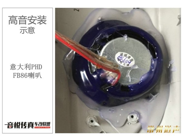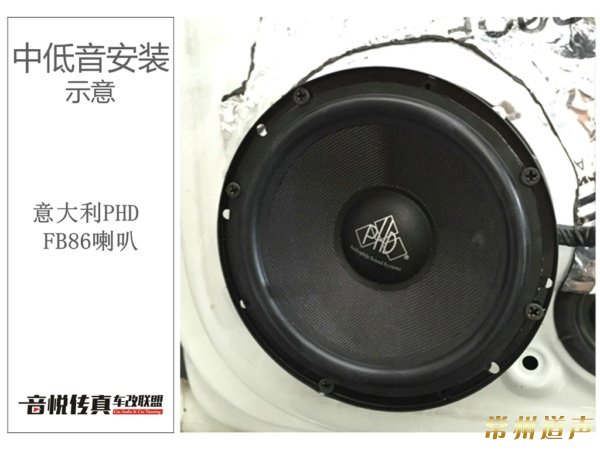 车门位置原位安装意大利PHD-FB86套装喇叭的中低音喇叭部分,而高音喇叭部分则原位安装在A柱位置上
