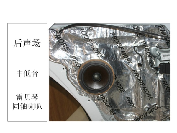 后声场的音响选择啦一套雷贝琴同轴喇叭,采用原车位无损安装不会破坏原车的零部件,做到了无损安装。
