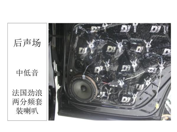后声场是一对劲浪的套装,由于车主在4s店买车时升级的前后门,觉得声音没太大提升,而且后门喇叭安装的太凸出,导致喇叭已被挤压变型,车主已经去4s店换过两只,来到常州,我们把前后声场的喇叭重新处理,这样有利于整个声场的平衡,也使后座的乘客获得更好的听音效果。