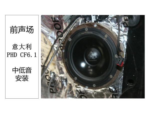 PHD CF 6.1中低音安装完成,加装喇叭垫圈后,声波几乎可以全部散射出去,不会引起门板共振,这样可以从安装方式上保证汽车音响喇叭音效不受影响。