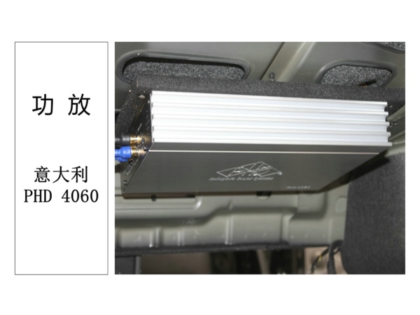 最后看看后备箱功放和低音安装。先看功放,意大利 PHD 4060 四路功放,全系列功放产品,可以满足最苛刻的发烧友的需求,为之提供最佳声音表现。优雅的超薄设计,保守的额定功率,简便的安装程序,内置电子分频器,精心挑选的原件,精良手工制造,大容量内置散热槽。如果不说功放的安装位置,我们是不能发觉功放的安装位置的,不但不占用空间,而且不影响美观。将意大利 PHD 4060 功放安装好后,安装低音,阿尔法超低音安装在后备箱位置。