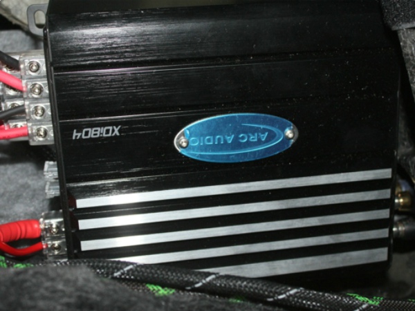 功放安装在尾箱位置,为了节省尾箱的可使用空间,我们将这台美国ARC804四路功放采用了放尾箱内部进行安装,两路推前声场意德国海螺套装喇叭,另外两路桥接来推10寸低音部分。