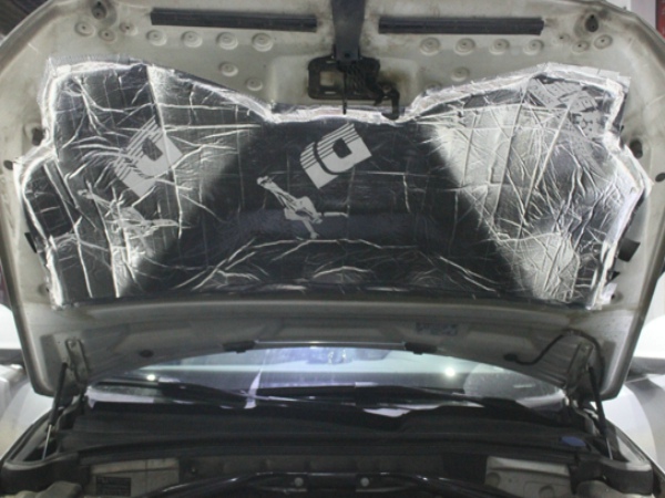 引擎盖止震选用的是DJ环保汽车隔音系列中的黑金刚止震板,表面使用DJ引擎盖隔热膜。