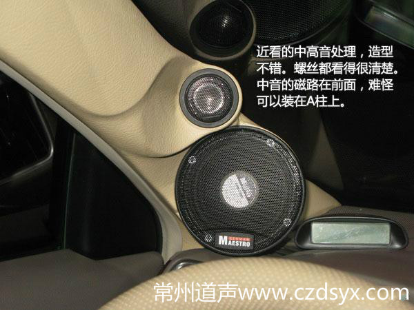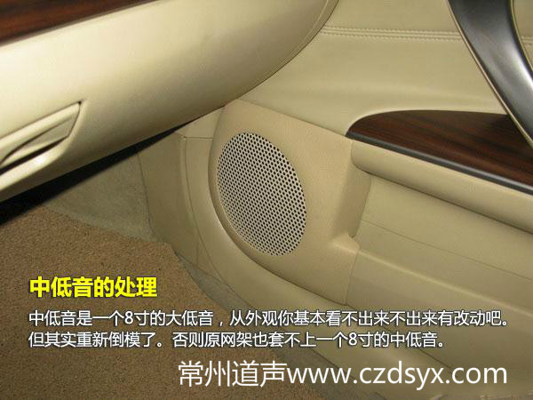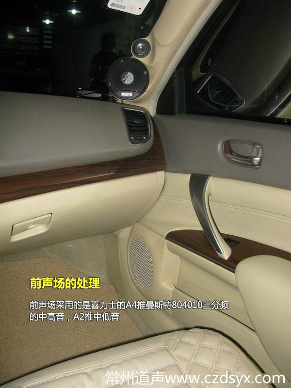 前声场采用的是喜力士的A4推曼斯特804010三分频的中高音,A2推中低音,中高音改在A柱上,造型美观,符合声学原理。而且,中高音是在平行面,因此高音与中音的衔接容易衔接好。后门是用主机推的喜力士的6.5寸套装,主要是烘托氛围,更好的堂音或混响等作用。