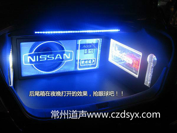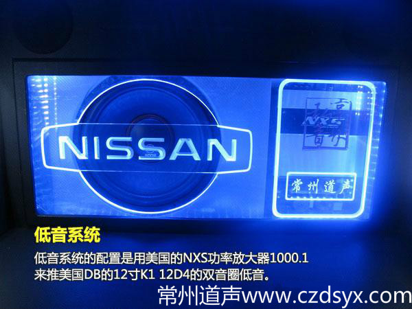 这台天籁的后尾箱布局合理,灯光也配得非常好。晚上的效果,非常抢眼球。低音系统的配置是用美国的NXS功率放大器1000.1来推美国DB的12寸K1 12D4的双音圈低音。喜力士的功率放大器放在两旁,另外还有两只来福的法拉级电容。