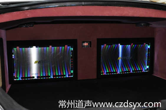 后备箱里的制作和前面的风格完全不一样,配用红黑相间的VIP改装皮革,功率放大器与处理器全部用有机玻玻保护,并配上七彩灯光。细心的观众可能会留意到它的低音单元似乎不见了,只看到非常简洁的后备箱。这也是这台车改装的特点之一,两只低音完全吊装,利用后备箱空间作为箱体。