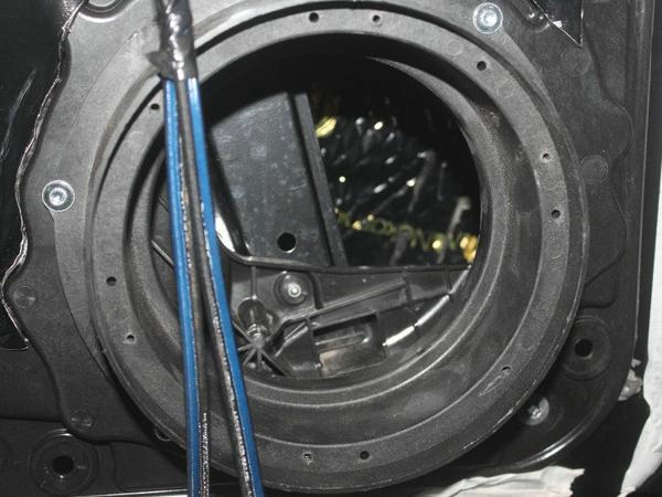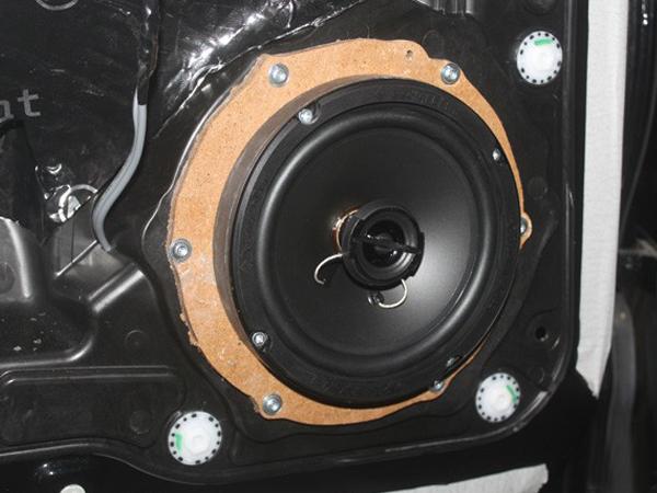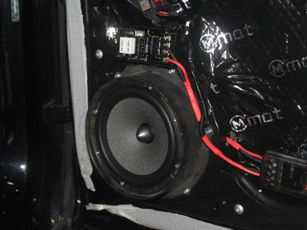 前声场法国劲浪中低音的安装,分频器靠近喇叭固定于汽车内门板上。
