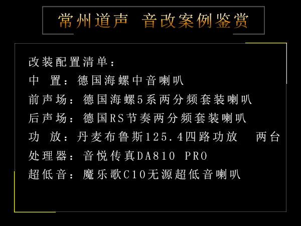 系统点评:升级完成后的汽车音响,音质清晰自然,声音清脆爽朗,细节的表现力出色。魔乐歌C10低音单元的加入更是给整套音响系统带来更多的低频动感听感体验,让音乐的现场感表现极佳......
