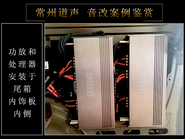 功放及处理器固定在尾箱内饰板里面,加装一台音悦传真DA810 PRO处理器作为前级,保证整个声场系统有优质稳定的信号输出,声音的解析力更强。前后声场在丹麦布鲁斯四路功放的推动下,使得音乐更显干净利落,清晰亮丽。