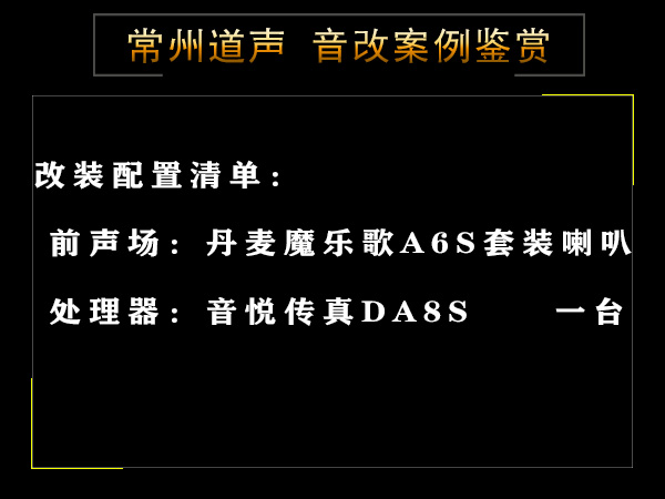 清单:前声场:丹麦魔乐歌A6S两分频套装喇叭 /处理器:音悦传真DA8S一台(下图)
