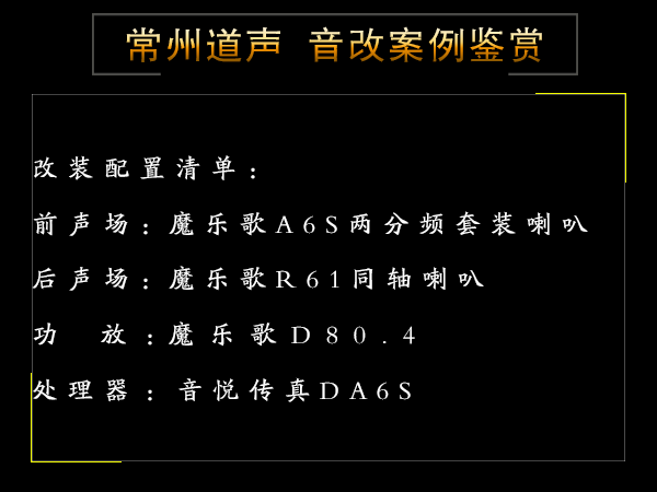 清单:魔乐歌A6S两分频套装喇叭/魔乐歌R61同轴喇叭/魔乐歌D80.4功放/音悦传真DA6S处理器改装实拍