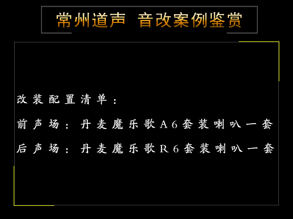 系统点评:这套音响系统的亮点就是音质干净悦耳,声音通透饱满、低频有力,声音包围感强烈,坐在车上听音乐环绕效果非常立体,感觉棒极了,得到车主深厚的喜爱!