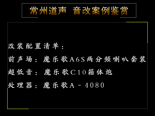 系统点评:一套好的音响系统离不开专业的改装技术和合理器材的搭配,以及专业调音的重要性。具有强大调音功能的魔乐歌功放赋予了这套喇叭+低音炮最醇厚的声音演绎,高频细节表现得明亮通透,人声部分也表现的细腻柔滑,整体音效表现出华丽贵气的感觉。