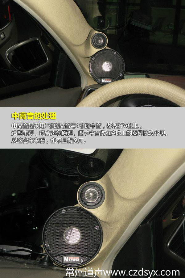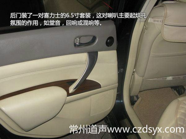 前声场采用的是喜力士的A4推曼斯特804010三分频的中高音,A2推中低音,中高音改在A柱上,造型美观,符合声学原理。而且,中高音是在平行面,因此高音与中音的衔接容易衔接好。后门是用主机推的喜力士的6.5寸套装,主要是烘托氛围,更好的堂音或混响等作用。