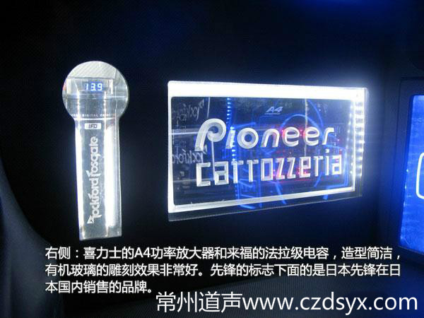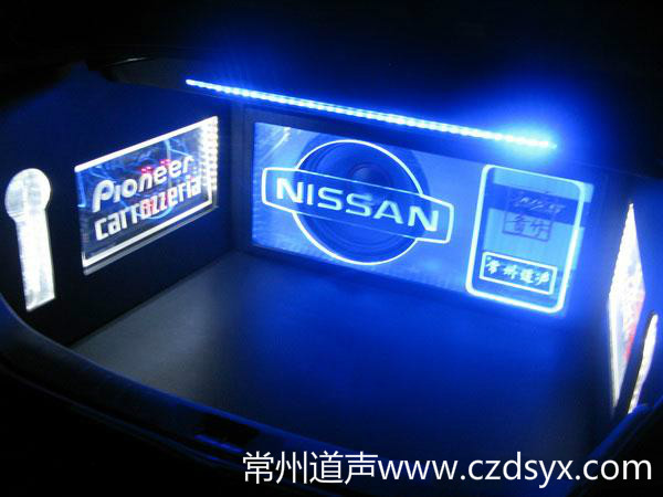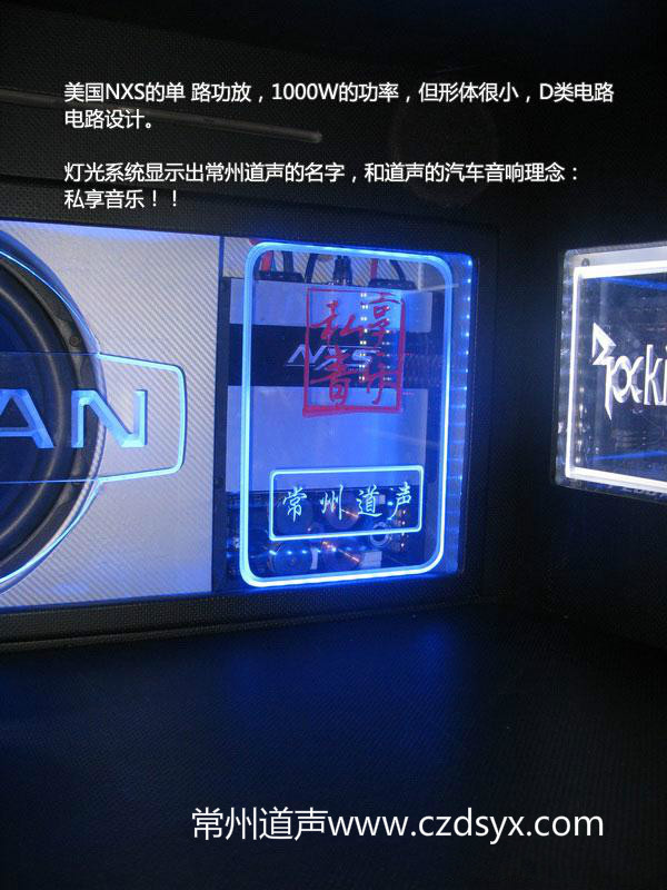 这台天籁的后尾箱布局合理,灯光也配得非常好。晚上的效果,非常抢眼球。低音系统的配置是用美国的NXS功率放大器1000.1来推美国DB的12寸K1 12D4的双音圈低音。喜力士的功率放大器放在两旁,另外还有两只来福的法拉级电容。
