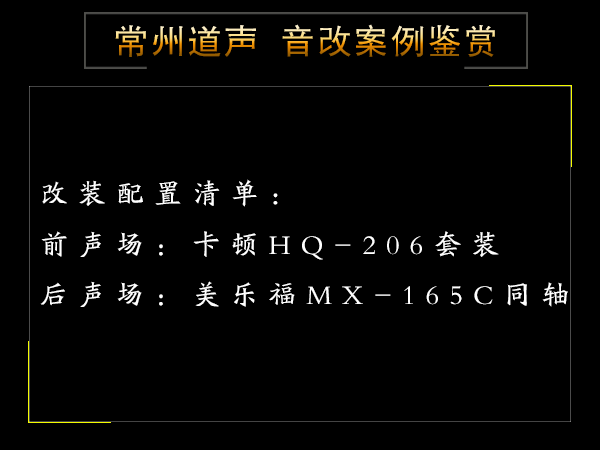 改装配置清单:前声场:卡顿HQ-206套装/后声场:美乐福MX-165C同轴喇叭