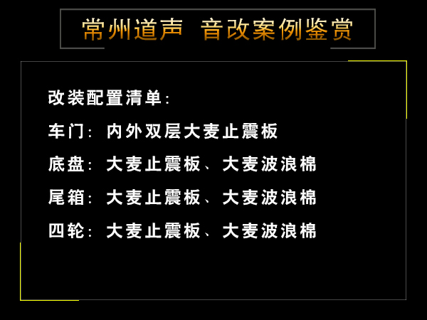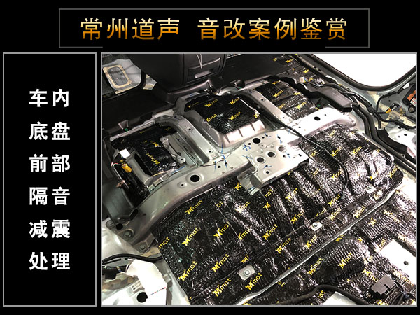 车内底盘前部跟中部第一层先使用大麦止震板进行铺设,在强化钣金同时,有效阻止共震的延伸。